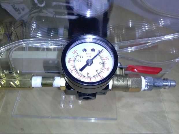 Conecte el puerto de los solenoides 1 al colector de aire. Puertos no se utiliza en el colector necesita enchufarse. Conecte el manómetro a la válvula de bola. Conecte el otro extremo de la válvula de bola a un regulador de aire. Gradúe el regulador a 25 psi para comenzar con. NO ir nunca más allá de 100 PSI o los sellos de los solenoides que se destruyen. Conecte el regulador del compresor de aire. Mantenga la válvula de bola cerrada hasta que los solenoides están cableados para arriba.