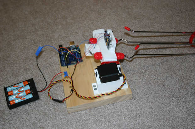 Montar las piezas y los cables según el esquema. El sketch de Arduino que siempre hará que el mecanismo bajar durante dos segundos y luego subir. Permanecerá en la posición superior hasta que el detector ultrasónico reconoce que la rueda es más cercana al mecanismo, luego el ciclo se repite.