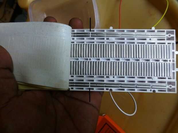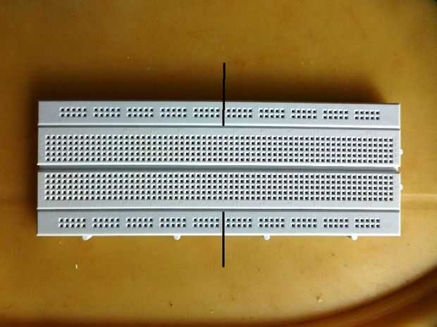 El tablero de pan que he utilizado contiene dos porciones separadas que he marcado con líneas negras. Si se abre la parte posterior de la Junta de pan, puede ver fácilmente que las conexiones de las líneas de autobús en los extremos se rompen a la mitad. Por lo tanto, aquí tienes 8 autobuses de 25 terminales conectados en el tablero.
