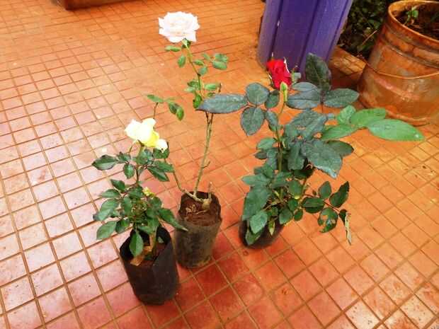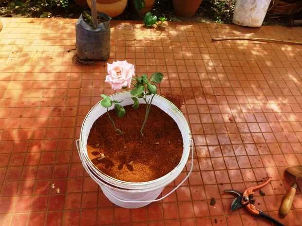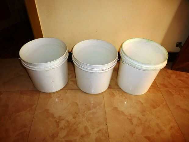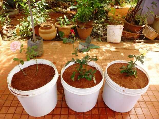 Compré cuatro pedazos de estos baldes plásticos para este proyecto. Tres de estos utilizo para plantar rosas y uno para almacenar agua para el sistema. También drenaje perforado de los agujeros en el fondo de los cubos y plantado tres plantas color de rosa en ellos