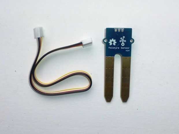 Grove Sensor de humedad con Cable de conexión : el Sensor de humedad se utiliza para detectar el nivel de humedad del suelo, que funciona basado en la medición de resistividad de suelo. El sensor muestra un valor menor cuando el contenido de humedad es bajo y muestra un valor más alto cuando el nivel de humedad en el suelo es alto. El Sensor de humedad se puede conectar directamente a un puerto analógico de la Grove Base mediante el cable conector.