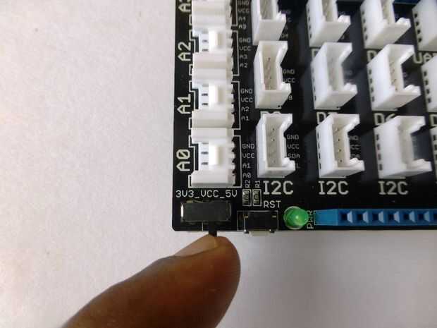• Conectar el blindaje de la Base de Grove - The Grove Base escudo V2 es compatible con la mayoría de las placas Arduino disponibles. Algunas placas funcionan con fuente de alimentación de 5 voltios y algunos con 3.3 voltios. Intel Edison Breakout Junta se basa en la placa de Arduino Uno que trabaja en la fuente de alimentación de 5 voltios. Puede encontrar el interruptor selector en el escudo de la Base cerca de la A0 de conector analógico. Coloque el selector de alimentación a 5 voltios. El número de pines en Grove Base escudo es el mismo que de tablero de Arduino Uno, así se podrá insertar directamente en el tablero de arranque de Edison.