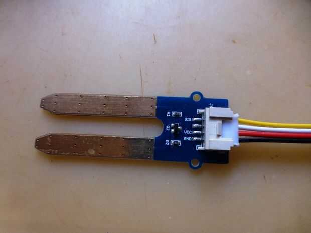 • Conectar el Sensor de humedad - usando el conector de los cables proporcionados con el módulo, conecte un extremo del conector del Sensor de humedad y el otro extremo al conector analógico A0 en el escudo de la Base de Grove. Los conectores se pueden conectar una forma sólo por lo que no te preocupes de conexión incorrecta.