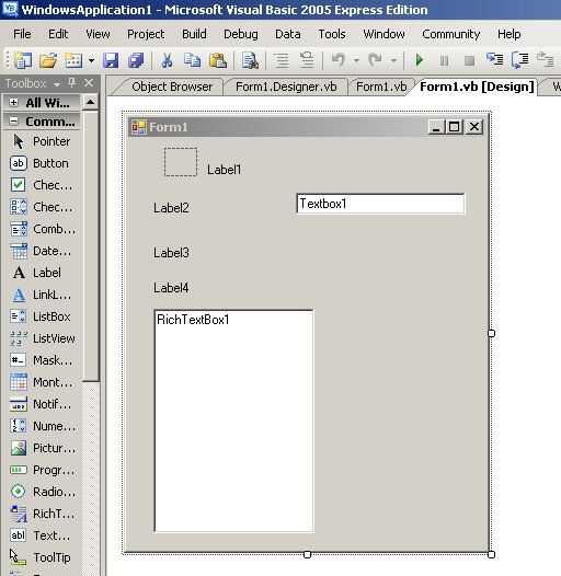Después de crear un vb.net nuevo proyecto el primer paso es crear un formulario. Este formulario tiene un cuadro de imagen, 4 etiquetas, un cuadro de texto y un cuadro de texto enriquecido. También tiene un temporizador (no se muestra) que cayó en el formulario así. El cuadro de imagen está al lado de label1 y puede ser cualquier tamaño. Las propiedades de estos objetos se definen en el código en la página siguiente.