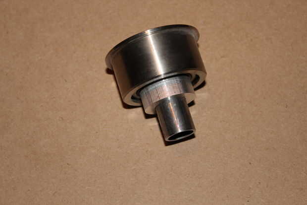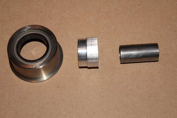 El único problema con estos rodamientos era que su diámetro interno (ID) métrico; algo así como 30 mm. La tubería que terminé usando como la barra de brazo giratorio 3/4" diámetro externo (OD). Por lo tanto, necesitaba un acoplador de interfaz ambos juntos. No gran cosa si usted tiene un torno y alguna acción de aluminio. Las fotos de arriba muestran la interfaz.