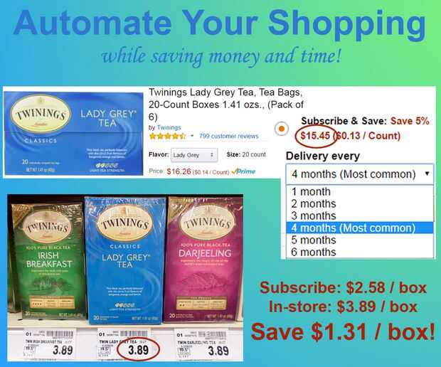 Para automatizar mi Abarrotes y tiendas de mascotas, mantener registro de qué artículos no perecederos nuestra casa compraron regularmente durante un período de seis meses. Después de ver la frecuencia con compraron diversos artículos, fui en línea ver qué suscripciones automatizadas podrían reemplazar viajes a la tienda con frecuencia has comprado artículos. (Puesto que consentimos a nuestros perros, este resultó con un montón de diferentes perros trata!) También compara precios y encuentra que no sólo muchas suscripciones automatizadas hacen vida más fácil por nos ahorra tiempo valioso, sino nos ahorran dinero también! Así que si quieres automatizar sus compras regulares, darte más tiempo para hacer cosas más importantes y hasta ahorrar algo de dinero, entonces esta ' ible es para ti!