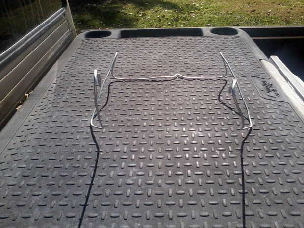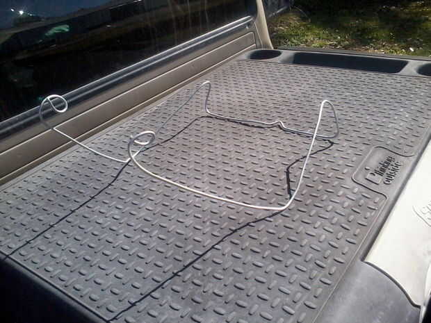 Para empezar, necesitamos 5 a 6 pies de un gran calibre de alambre.  No estoy seguro del calibre del alambre que he usado aquí. También necesitaremos un par de pinzas.  He utilizado ángulo alicates como que es lo que yo fácilmente disponibles.  Entonces comencé a doblar el alambre para hacer un par de ganchos para montar en el volante y luego otro par de curvas que básicamente un estante.