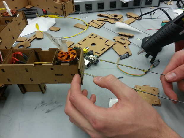 Nosotros primero doblado alambre grueso en forma de U e inserta en el marco del quadcopter. Optamos por utilizar pegamento caliente para esto debido a su grosor. Si decides doblar los extremos para arriba como se hizo, asegúrese de que los extremos tienen un montón de espacio para no chocar con los apoyos.