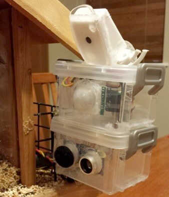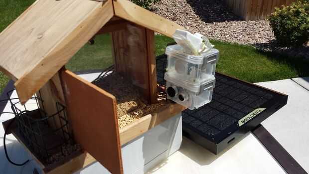 Si te fijas bien en la foto de nuestro alimentador puede ver un pequeño muro frente a la cámara. Esa pared se vuelve importante porque estamos saltando el pulso ultrasónico de esa pared. Sabemos de la prueba hasta qué punto esa pared es. Una lectura menor que la distancia a la pared indica que algo es de la forma (es decir) un pájaro. Como se puede ver en la foto de arriba el sensor está encerrado en un recipiente de plástico. El sensor no es impermeable por lo que forma un soporte personalizado que reduce al mínimo la exposición a los elementos. No estamos afirmando esta configuración es 100% a prueba de todo, pero ha sobrevivido a incontables tormentas de Colorado sin ningún problema hasta ahora.