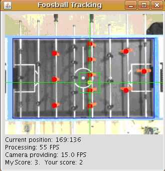 Como se ve en la captura de pantalla, la pelota y los jugadores oponentes se realiza un seguimiento en cada actualización de marco. Además, el contorno de la tabla se encuentra visualmente, es por eso la cinta de pintor azul fue usado para crear un contorno visual. Objetivos se registran cuando el ordenador no puede localizar la bola para 10 fotogramas consecutivos, normalmente indicando que la bola cayó en el meta, de la superficie de juego. Cuando esto sucede, el programa inicia un byte de sonido para animar a sí mismo o boo al oponente, dependiendo de la dirección de la meta. Un sistema mejor, aunque no tenemos el tiempo para implementarlo, sería usar un par de simple emisor/sensor infrarrojo para detectar la bola en la meta.