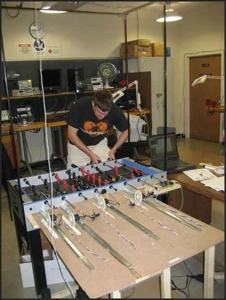 Medimos la distancia requerida por la distancia focal de la cámara para adaptarse a la mesa todo en el marco. Para este modelo de cámara, ese número resultó para ser poco más de 5 pies. Utilizamos estantería estantes disponibles en cualquier tienda de hardware más importante para construir un soporte para la cámara. Los estantes de la estantería se extienden hacia arriba de cada una de las cuatro esquinas de la mesa y son Cruz-apoyados por soportes de ángulo de aluminio. Es muy importante que la cámara está centrada y no rotación angular, puesto que el software asume los ejes x e y - se alinean a la mesa.