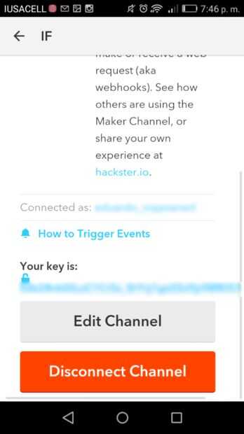 Para hacer la conexión con el ESP8266 necesitaremos una llave suministrada por la misma aplicación que tecla se utiliza en el código para hacer la solicitud de la Web así que puede que desee escribir.
