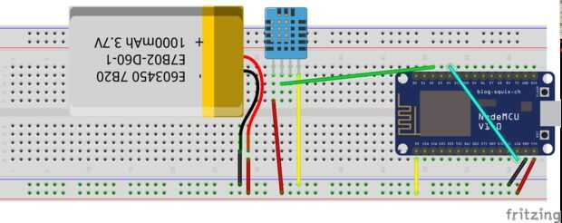 Este circuito es fácil pero es necesario recordar que estamos utilizando la mochila NodeMCU Lipo que permite la carga de una batería de Lipo por el conector USB y por la fuente de tiempo nuestro ESP