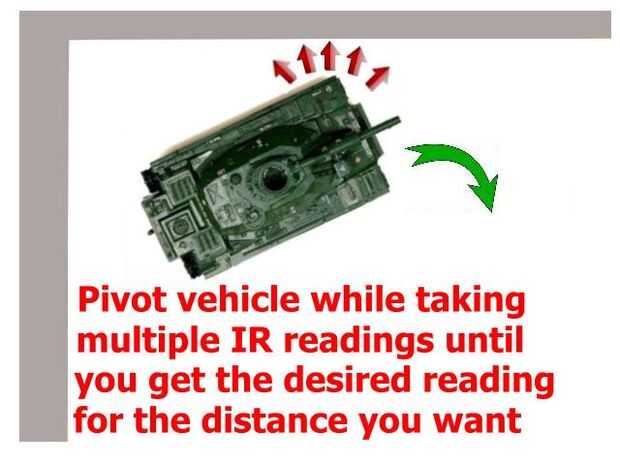 Si tuvieras codificadores de rueda, o mejor aún una brújula a bordo, podría medir con precisión el ángulo. Pero este proyecto está diseñado para trabajar con sólo los componentes especificados. Así, el problema tiene que resolverse con solo dos sensores, que no son 100% confiables, especialmente cerca de un objeto.