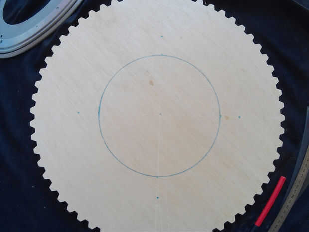 Primero, localice el centro de la gran marcha utilizando una brújula. Que el uso de la brújula dibuja dos círculos en el pllywood, uno con el mismo diámetro del círculo interior del rodamiento y otro con el diámetro exterior. Después de colocar el cojinete interior de los círculos, marcar los 4 agujeros para el tornillo.