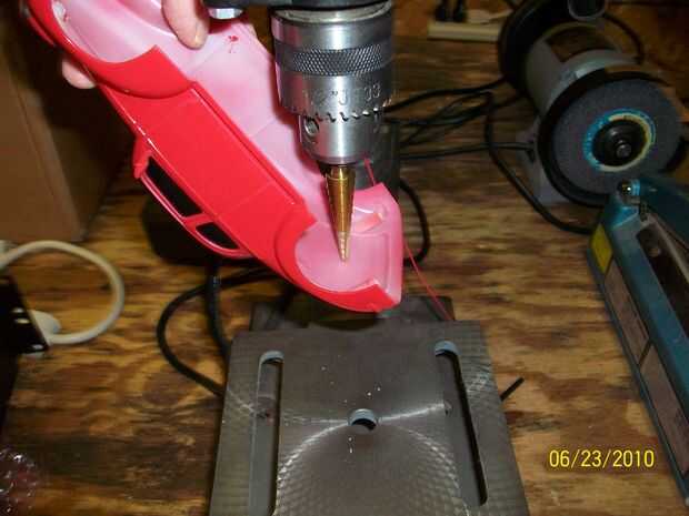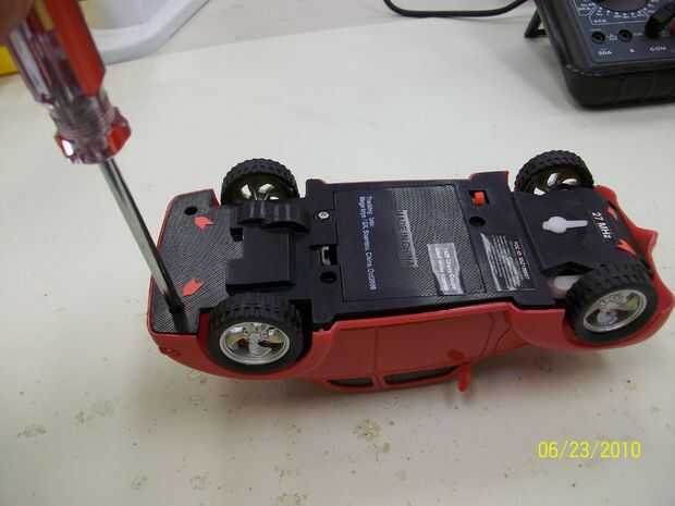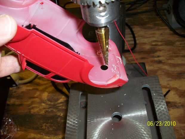 Perfore un agujero de 3/8" en la parte trasera de la carrocería para un lugar donde los cables se ven fuera del coche. Coloque el cuerpo en la parte superior del chasis mientras que enhebrar los cables a través del agujero en el tronco. Atornille el cuerpo y el chasis con los 4 tornillos que quitó anteriormente.