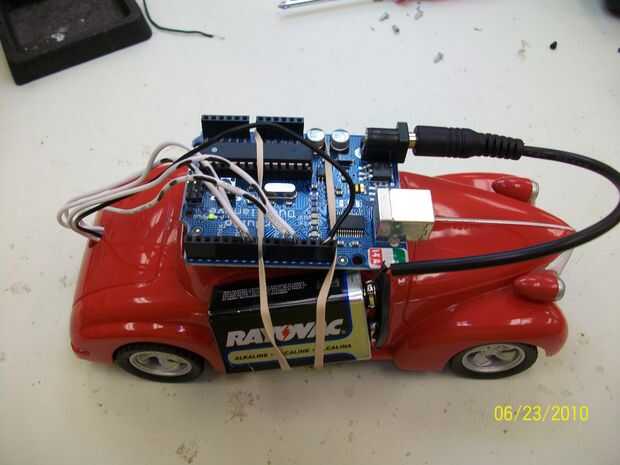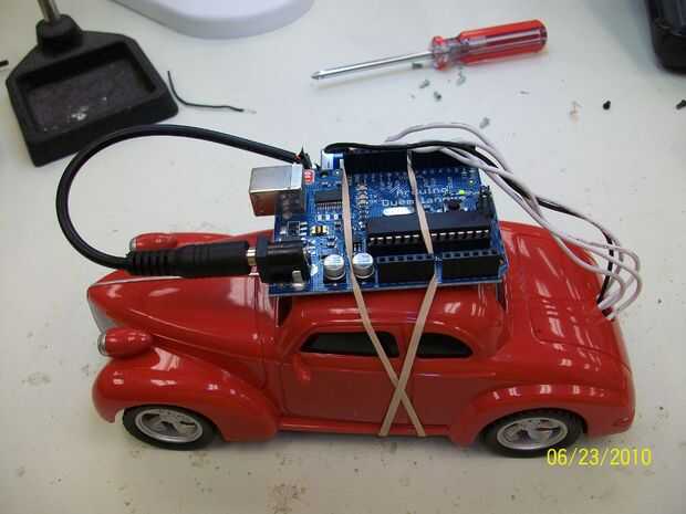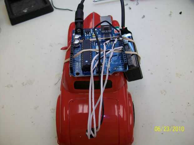 Con cortarla, ajuste el Arduino en el techo del coche. Pele los extremos de los cables y conectar a los pines de Arduino según cómo funciona el programa. También Coloque un soporte de la batería de 9V y enchúfelo en el Arduino.