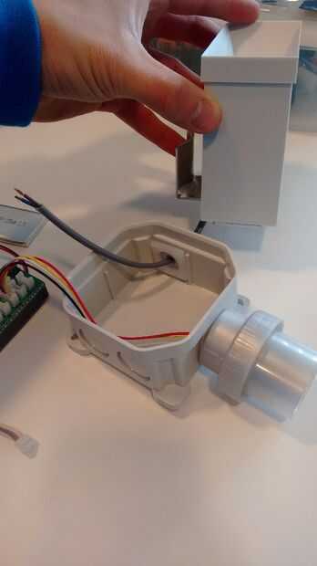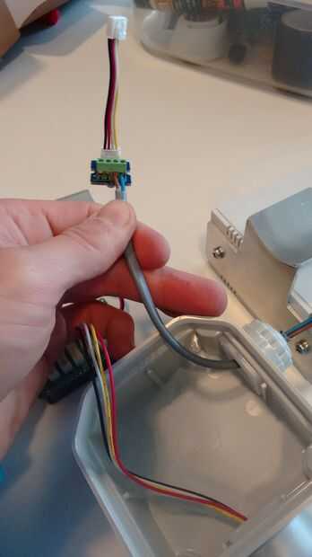 Utilizamos un medidor de lluvia grado industrial hecho por Pronamic: El Rain-o-Matic pequeño (con el accesorio de soporte de poste). Los alambres de la galga de la lluvia están conectados a un borne de tornillo de Grove. Conecte el cable azul a la 1 º posición (señal) y el cable marrón a la 4ª posición de la (tierra) de la terminal de tornillo.