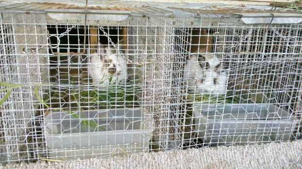 es difícil de ver en la foto, pero tuve que hacer una puerta en el extremo de cada una de las jaulas.  Corté un trozo de rejilla de alambre lo suficientemente grande como para que puedan salir para servir como la puerta y perfore el orificio en la jaula un poco más pequeño que la puerta.  Aseguró la puerta con alambre en la parte inferior para servir como una bisagra. Las puertas están aseguradas en la parte superior con los clips del perro, y su plato de agua tiene dos ganchos en ambas esquinas para garantizar aún más la puerta en caso de que uno de los clips no está bien asegurado.