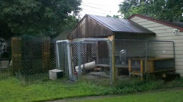 me quedé rígido verde cercado en el extremo y conectado a la perrera para permitir que el recinto que atenta, utilicé puertas bi-fold y enrejado que eran aproximadamente la altura de las vallas verdes.  Ésos fueron conectados a la cerca del acoplamiento de cadena entre mi propiedad y de su vecino.
