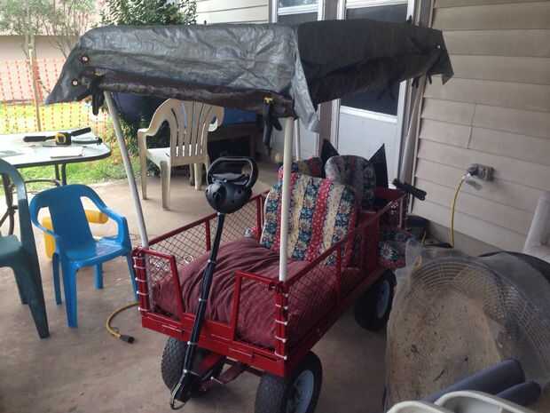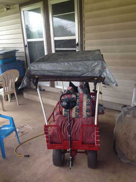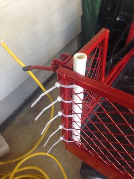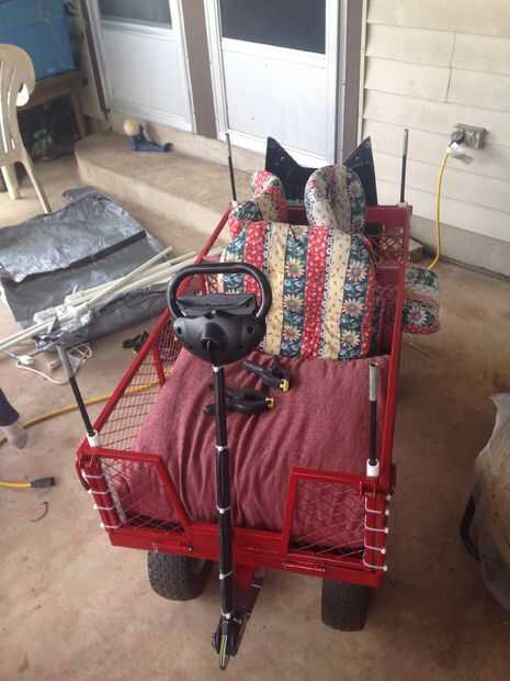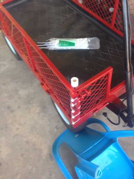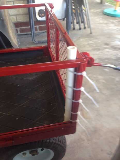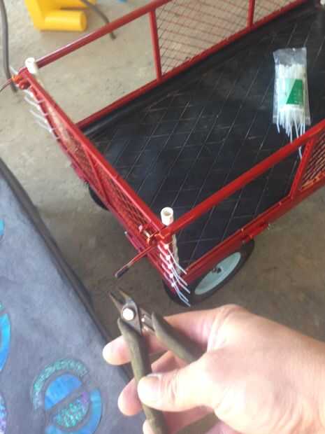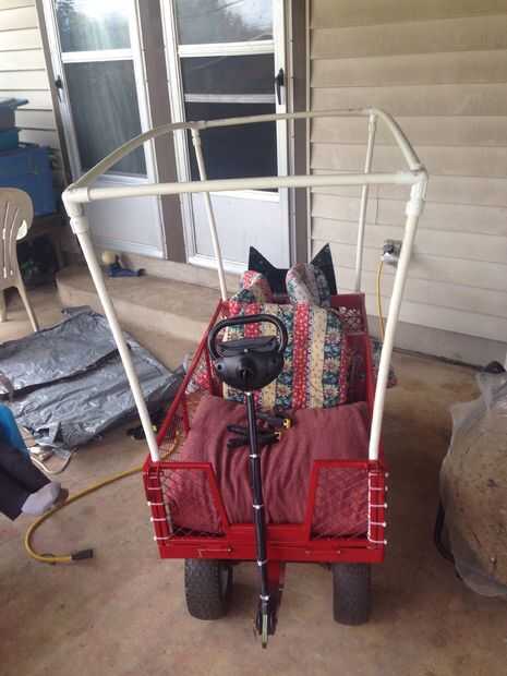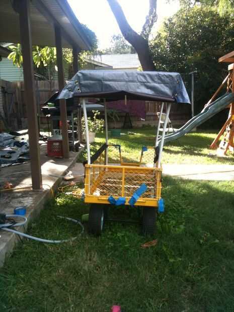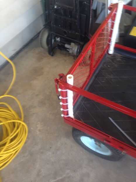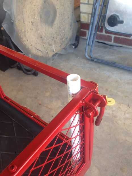 Usted probablemente puede hacer este proyecto con cualquier tipo de carro jardín pesados y sus medidas pueden ser diferentes a la mía, pero se trata de cómo la construí. Corto 4 piezas de 1/2 pulgada schedule 40 PVC tubería trozos de 12,5 pulgadas. Estos al vagón y utiliza para mantener la cubierta en lugar. Les corté este tamaño, ya es más alto que la profundidad exactamente 1/2 de pulgada de la carreta, y quería adherirse sólo un poco. Poner tapones en éstos y perfore un pequeño agujero en el tapón de drenaje. Coloque estos tapa lateral en las cuatro esquinas del carro y zip lazo en lugar. Tuve algunas estacas fibra de vidrio viejo ahí pasadas fallidas tiendas de campaña. Tomé 4 de los más flojos, y encajan perfectamente en el tubo de PVC que cerca de 12 pulgadas. Esto es donde se fija la cubierta. A partir de ahí, corte 4 trozos de PVC de 24 pulgadas de largo. Estas son las columnas, los coloca en los postes de la carpa. Puse el MPT x adaptador de S en la parte superior y atornillar un codo de 90 grados en cada uno. Se cortan las piezas delanteras y vuelta superiores a 24" longitud. y se cortan las piezas superiores laterales a 48" longitud. Esto hace el pabellón ligeramente más grande que la huella de la carreta y le da un poco sobresaliente todo lo que le da más sol o lluvia cobertura. Esto también hace que los montantes se arquee un poco lo que es permanecer en el carro mejor. Nada se pega para que todo viene aparte y rueda para arriba en un paquete compacto y agradable. Todo esto tomó 19,8' de tubería de PVC, pero compré tres 10' las piezas, porque usted tendría que hacer cortes perfectos que sólo 0,2' de chatarra sobrante.