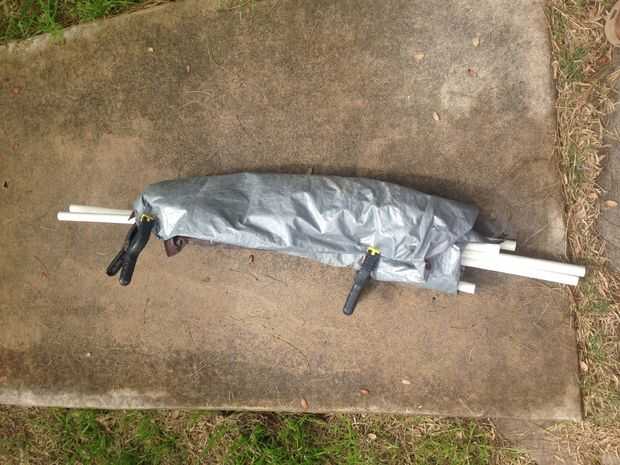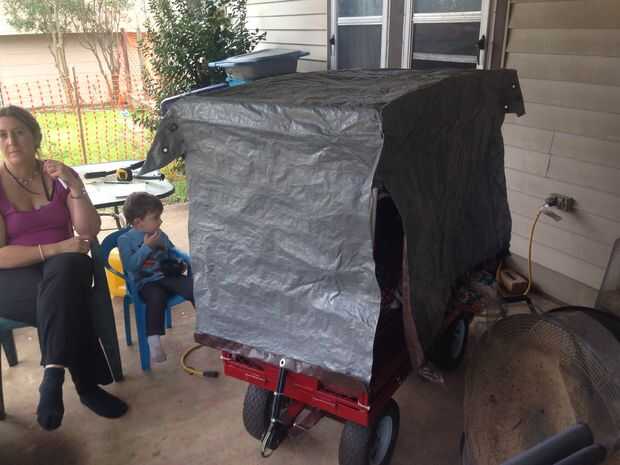 Para hacer la cobertura del dosel, es mejor en un día sin viento y un ayudante. Puede hacerlo por sí mismo, pero es mucho más fácil, si tienes un segundo juego de manos. Llevó a la lona y coloca sobre toda la cosa. Hemos cubierto sobre el vagón, modo que el lado largo en el lado largo, lado corto en el lado corto. Nos aseguramos era cuadrado y sería lo suficientemente largos para cubrir la cosa entera. Entonces solíamos abrazaderas, para mantener en su lugar cerca del fondo en las cuatro esquinas. Tomamos un sharpie y hechas las marcas donde se planificó cortar la lona en la parte superior. Un criterio ayuda a mantener las líneas rectas. Fuimos a cada esquina y lanzó el clip de resorte, dejando los otros atados. Nosotros podríamos entonces en abanico el material para esa esquina, debe tomar una forma del triángulo. Hicimos las marcas con el sharpie y yarda del palillo dejando sobre un triángulo de 6 pulgadas en la parte superior, luego una marca larga rastreo el PVC largo vertical del marco del toldo. Los triángulos pequeños en la parte superior están donde voy a poner las arandelas de latón. Hicimos esto en las cuatro esquinas. Cuando hemos trazado para corte, parecía un gigante Cruz con pokey esquinas en el centro. Corte el exceso y poner ojales de latón en las cuatro esquinas, en la parte del triángulo mientras plegable, esencialmente formando una caja apretada que cabe en el marco de PVC. Estos ojales de latón son baratos, $2,95 por 100 en el puerto carga herramientas e incluso viene con el kit de instalación. Aquí está el problema, son un verdadero dolor en la parte trasera para instalar a menos que tenga un vicio. El kit de instalación consiste en romper las dos partes con un martillo y el kit de instalación deja mucho que desear, pero si tienes un vicio usted podría simplemente presione los dos juntos. Una vez que están instalados. están allí para siempre, a menos que se rasga la lona. Una vez que tuvimos todos los ojales instalados, comprobamos el ajuste, y era bastante escaso. Puse una cuerda del amortiguador auxiliar en cada esquina, de uno de los ojales a la estructura del carro, y se asegura. Enrolle los lados y mantenerlos en su lugar usando presillas tuve que poner alrededor de, costo = $0, ocho en total, dos para cada lado. Para baje los lados, simplemente suelte las presillas y utilizarlos para fijarla en la parte inferior de la carreta. Para guardar para el transporte, sólo desmontar todo excepto lo que se une al carro, poner todo en la lona y ruede para arriba. Utilizar dos de las más grandes presillas que sujetan el paquete, pero los dos polos más grande se pegan hacia fuera. Es lo mejor que podía hacer, para que se ajuste en el carro para el transporte.
