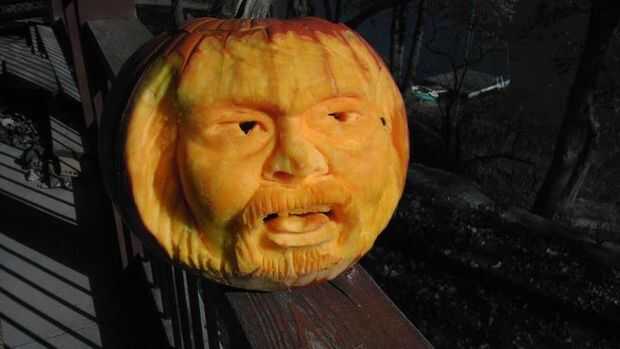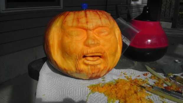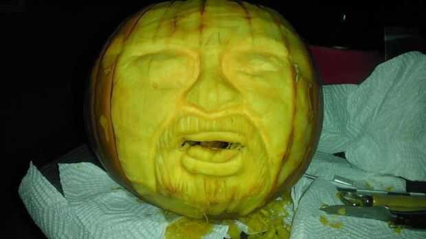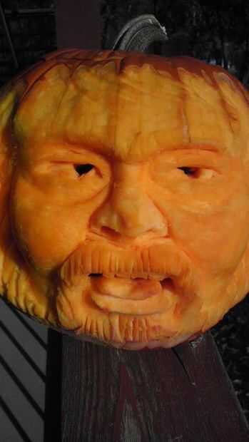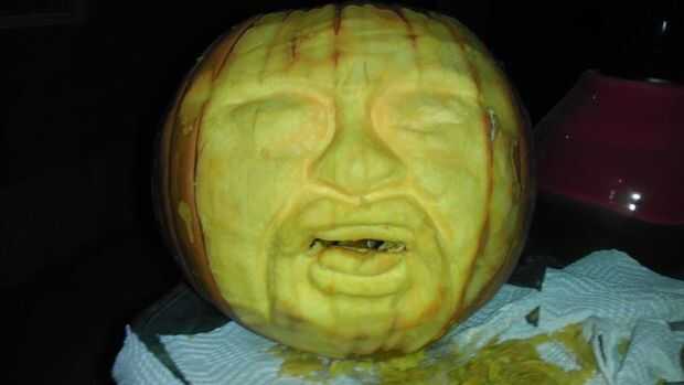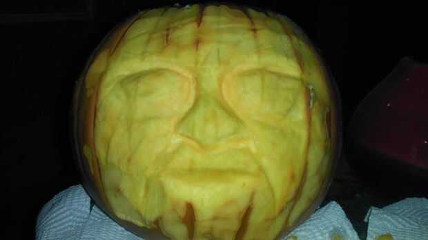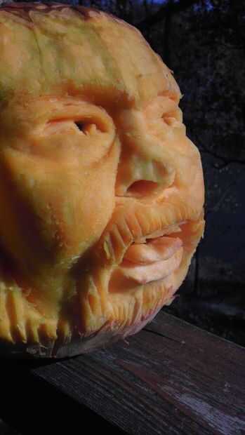 Básicamente comencé como cualquier otra calabaza talla por cortar la parte superior y sacar con pala hacia fuera las entrañas. Entonces tomé un pelador de verduras y un cuchillo de cocina y sacó un montón de la la piel. A continuación, con una combinación de bucles de arcilla y un cuchillo del exacto, empecé a trabajar en la eliminación de la carne. Los ojos y el puente de la nariz eran muy profundas y tuve que tener cuidado de no entrar en la carne stringier. Después conseguí más de lo que hay pulir con algunas toallas de papel pero creo que podría funcionar mejor un papel de lija de grano fino. Estaba trabajando de una serie de scowling auto retrato caricaturiza que estaba bastante contento con, pero no son en absoluto indicativa del producto final.