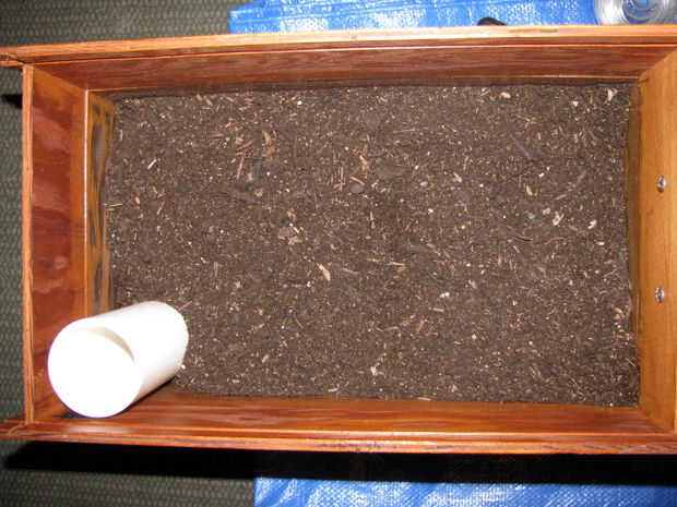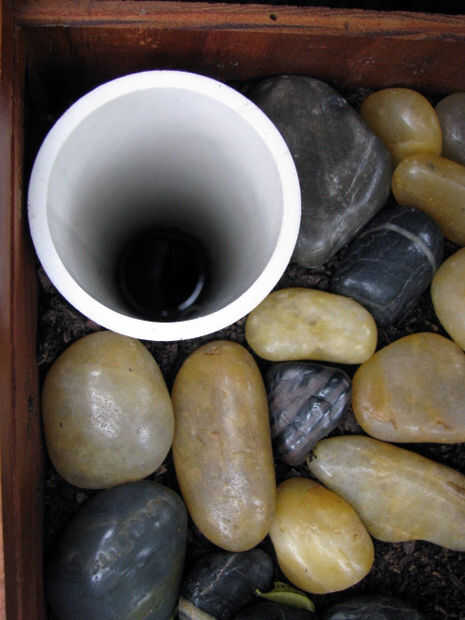 Agregar más suelo y suficiente fertilizante para el tamaño de su contenedor. Deje por lo menos una pulgada desde el borde de la cubierta de tierra vegetal, que podría ser un pedazo de paisaje lona, bolsa de plástico opaca o más rocas del río.