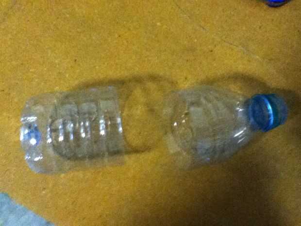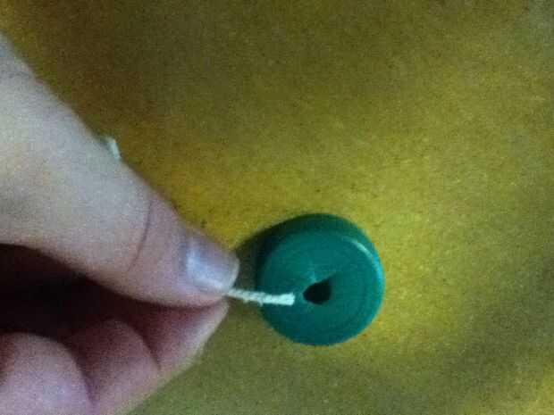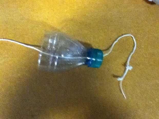 En primer lugar, cortar la botella por la mitad (yo usé las crestas en la botella para un corte limpio) y retire el tapón. Corte aproximadamente dos pies de la cuerda. Luego, corte un agujero lo suficientemente grande como para que la guita puede caber a través de él y la pequeña lo suficiente para que la suciedad no caiga a través de. Introducir la cuerda en el agujero y vuelva a enroscar la tapa. En cuanto a la otra mitad, solo ponerlo a un lado, usted va a necesitar más adelante.
