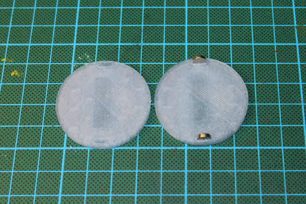 Usé imanes de 6x1.5 mm para las monedas. Simplemente colocarlas en las ranuras y cerrar las dos mitades de la cola.