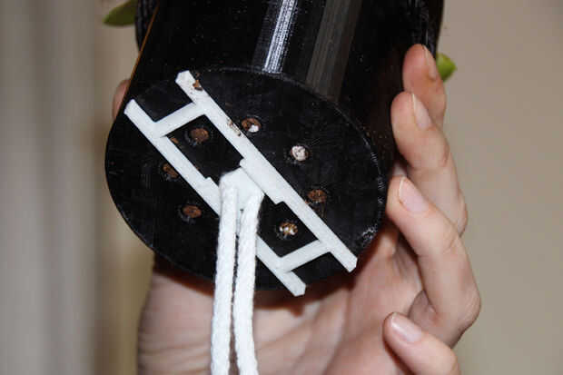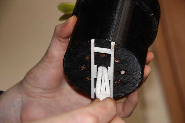 Usted necesitará un pedazo largo de 20 cm de hilo. Doblar por la mitad y colocarlo sobre el pasador, como se muestra en las fotos. Empuje cuidadosamente en el orificio en la parte inferior de la olla. Asegurarse que se detiene antes de llegar a la rhiozome. Para sostener en lugar simplemente dele vuelta alrededor.