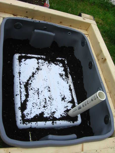 Una vez que el agua ha empapado en la suciedad más, llenar las tinas a la parte superior. En este punto, si tienes abiertos agujeros en las esquinas entre el recipiente de plástico y el marco de madera, rellenar estas con una sección de periódico rasgado, tela metálica o pantalla de la ventana.