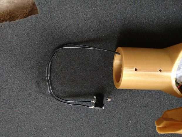 Para perforar los agujeros, pasar el interruptor boost por el agujero inferior de la montura y deslice la palanca hasta la posición, entonces usando una broca de 3/32 (o similar de tamaño, no es crítica) taladre el primer agujero, usando el 3D impreso los agujeros como guía.