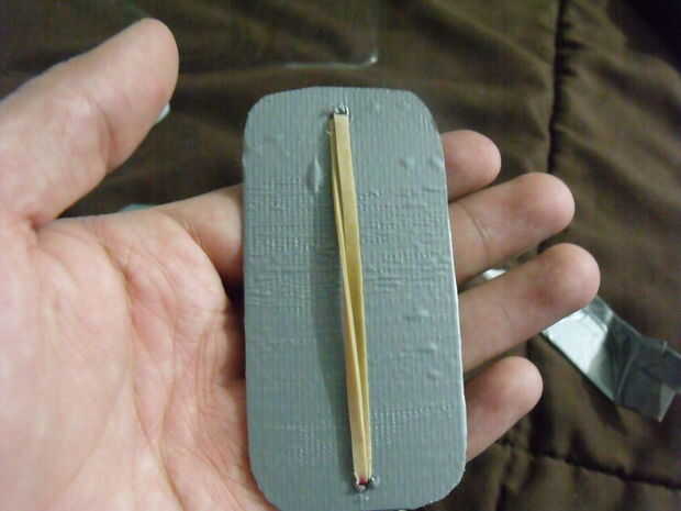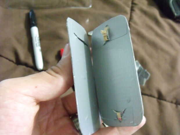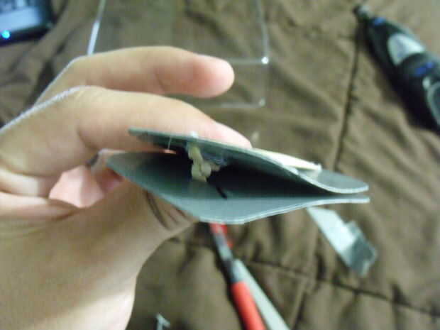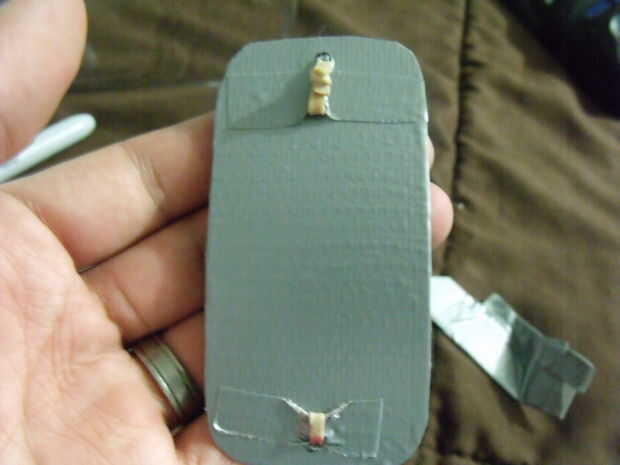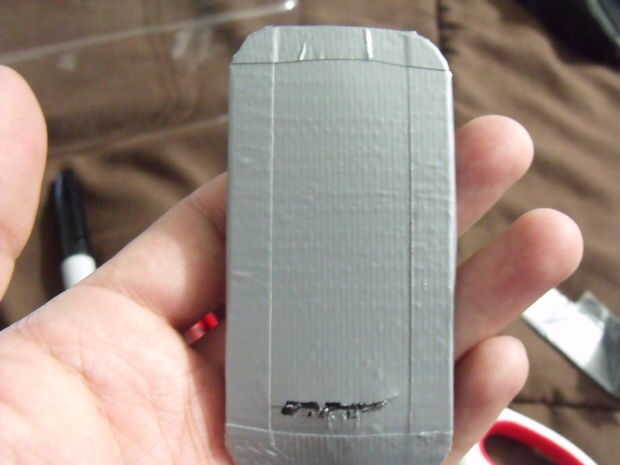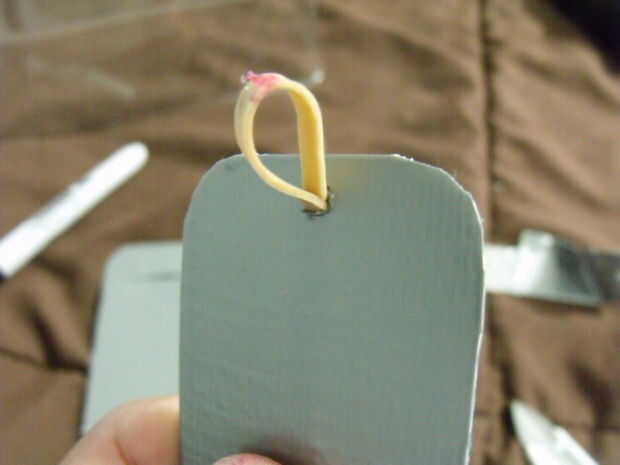 un lado de la goma en un agujero en un bucle y sujete con cinta adhesiva y repetir lo mismo en el otro lado. ahora colocar ambas piezas juntas y y cerca del en todos los bordes con cinta adhesiva.