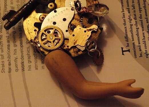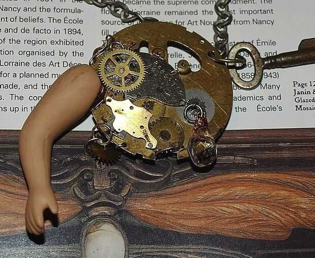 He utilizado las tripas de un reloj de bolsillo roto hace mucho tiempo, vintage, una llave de esqueleto que una vez había desbloqueado secretos de alguien y el brazo de un dolly de porcelana. (ella perdió en un ataque zombie), pobre querida...