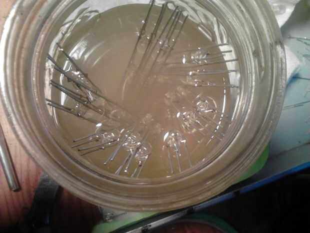 Después de construir sus torres, puso en un frasco de alcohol, antiséptico y cubrirla (yo uso un frasco de jalea pequeña), puede volver a utilizar el alcohol muchas veces. Poner las agujas en el frasco, cubrirlo y sacudir o agitar regularmente para obtener mejores resultados. Si usted puede dejarlas en la jarra durante la noche, parece funcionar mejor. Usted puede enjuagar con alcohol fresco después de la limpieza principal para bajar cualquier residuo pegajoso.