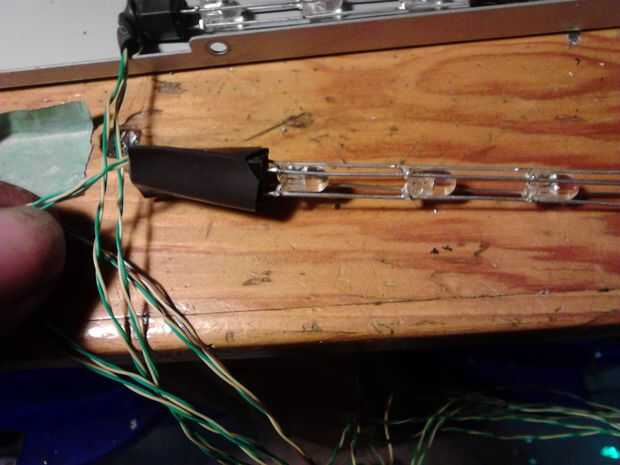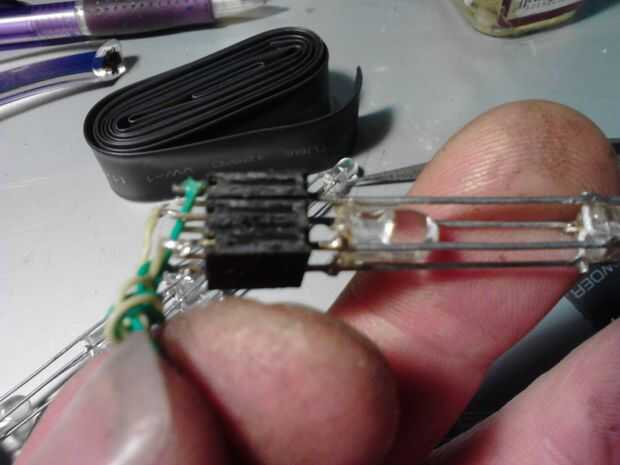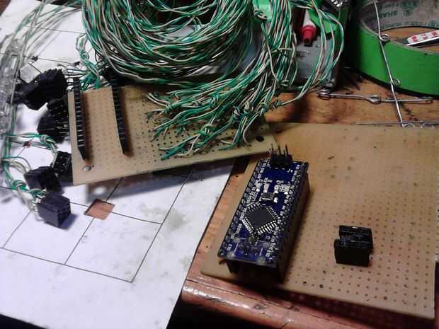 Necesita cables para ir desde el conector a la placa de circuito. Este Consejo llevó a cabo el microcontrolador, un conector de alimentación y necesitaba 64 cables para conectar los conectores. Necesitaba los alambres flexibles por lo que podría moverse libremente en el sombrero como que de los fracasos. Necesitaba muchos de ellos, y ayuda si hay un esquema de color para ayudar a que sane el cableado. Todo lo que encontré en un viejo cable de disco duro IDE. Son hilos muy finos, pero eso es aceptable, hecho un poco resistencia probablemente ayuda a evitar la sobreintensidad de corriente. Había soldado 16 sistemas de 4 cables a la placa de circuito, luego por cable los otros extremos a los conectores. Encontré que los conectores a mano tenían algunos Lime áspera, así que hice algunos lijado y deslizó algunos tubo termocontraíble sobre las conexiones para crear algún alivio de tensión. Recorta la esquina en el encogimiento del calor y utiliza como una marca de registro, para conseguir las agujas de la manera correcta. pero si usted consigue un mal, puede encontrarlo y solucionarlo con algunas pruebas.
