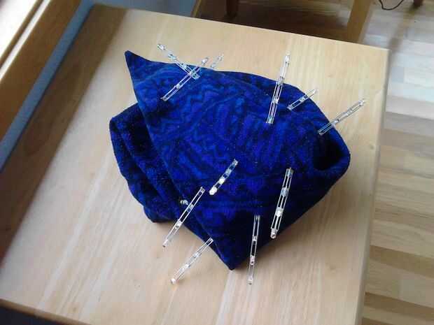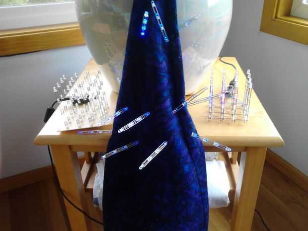 Para hacer el sombrero, tuve que hacer algunas cosas extra. Yo quería los conectores para conectar las agujas en, pero lo único que había era algunos conectores del sip, para usarlos, muchos de ellos! y una matriz de 3 por 3, donde las tomas de 4 esquina ajuste la aguja. Usé algunos pines sip para sostener los racimos de 3 zócalos juntos mientras el pegamento seca este lugar todo bien alineado.