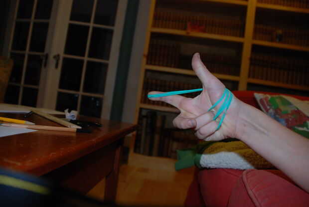 este es un tutorial sobre cómo hacer una pistola de goma.Todos los materiales que necesitas para hacerlo es la siguiente:4 palillos11 cortarlacintalápizuna reglaEso es todo! Disfrute del tutorial.Bandas de caucho que son demasiado pequeños pueden hac