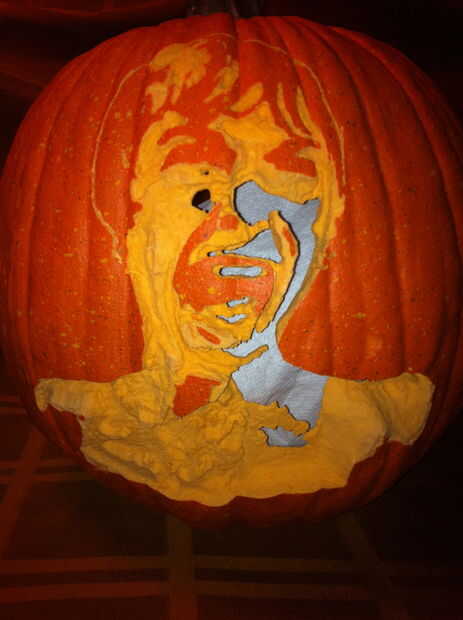 Ahora a tallar. En una calabaza real necesita intestinal antes de que comenzó a tallar pero falsas calabazas no tienen entrañas así que podemos saltar este paso aunque puede cortar un agujero de tamaño decente en la parte posterior para conseguir una sensación para el grueso de la calabaza. Normalmente para transferir su patrón usted tomar algo fuerte y todas las líneas del esquema de su patrón con un montón de puntos, cubrir esos puntos en la harina y su patrón. Los orificios de calabazas de espuma de cerca antes de que la harina se puede obtener por lo que nos va a dejar el patrón de la calabaza mientras tallamos.