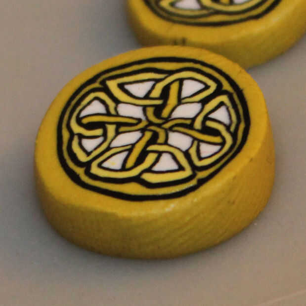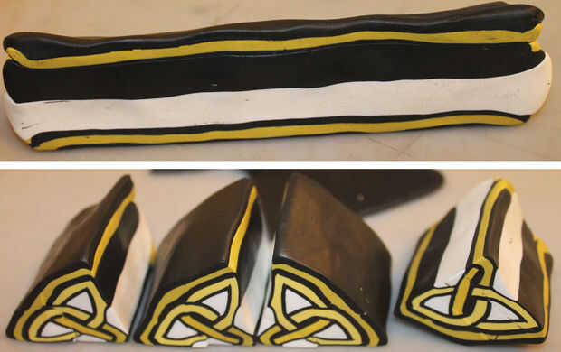 Para el nudo, crear sándwiches negro-amarillo-negro de arcilla, corte a la longitud y dóblelos en forma (véase las fotos). Una vez hecha la forma de nudos básicos, agregar blanco para mantener espacio. Un sándwich de negro-amarillo-negro final va en el exterior.