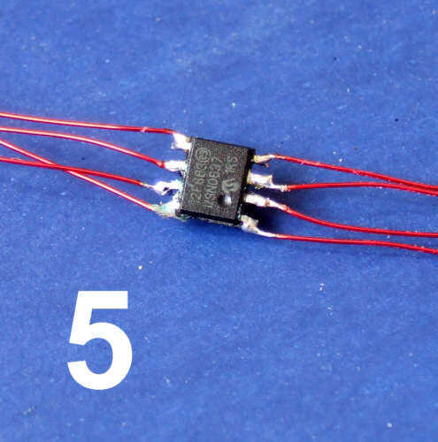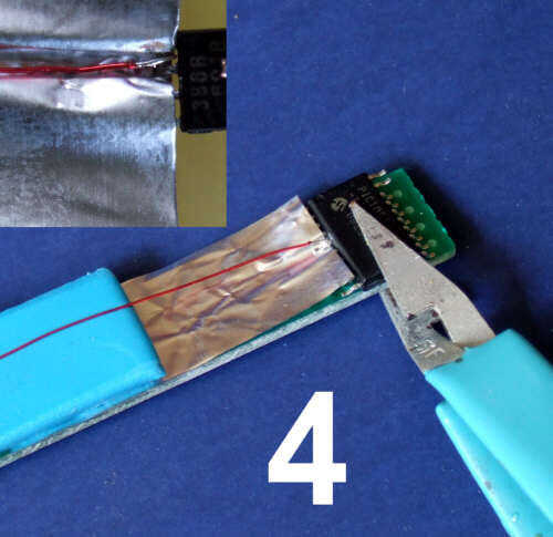 Inserte el borde de una pequeña plaza de papel de aluminio resistente por debajo de la clavija que vas a soldar y sobre los pernos en cada lado (pic4). Esto evitará que la soldadura fluya a los pernos adyacentes. También actuará como un disipador de calor. Abrazadera de la IC en una hoja de FR-4 de fibra de vidrio o perfboard. Ponga un trozo de la Loctite masilla sobre un extremo de la lámina de montaje para mantener en su lugar. El alambre del imán puede entonces ser sujeta con la masilla y en contacto con el pin del IC.