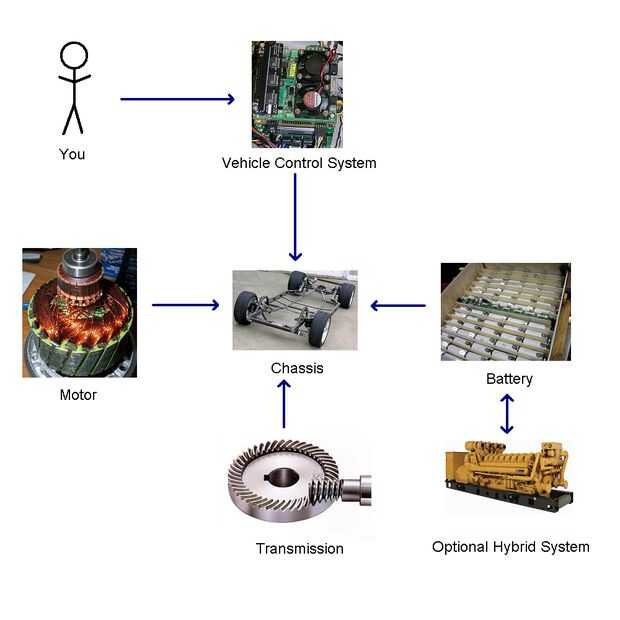 Conceptualmente, sin embargo diferentes la manifestación física, el funcionamiento de los vehículos son los mismos, como se muestra en el diagrama. EVs son cosas relativamente simples a un nivel muy básico.