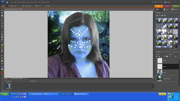5: con un pincel con el borde se desvaneció, poner puntos en yourface en blanco, deben salir un color azul brillante. También experimento, he hecho dos versiones a continuación, se les pueden colocar todo el rostro y piel, mediante diferentes cepillos ect.
