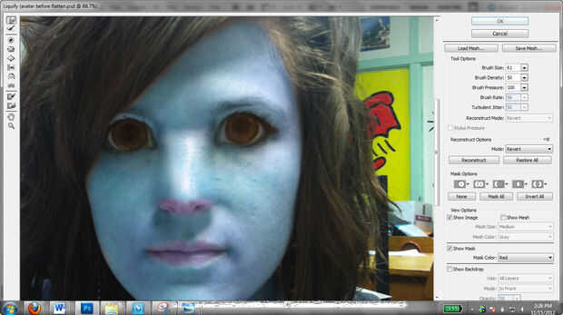 En el menú de licuar, utilice la herramienta engordar y en un tamaño de pincel que abarca el ojo entero.