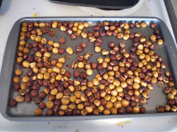 Poner sus avellanas en el horno unos 8 minutos. Tire las avellanas hacia fuera un poco y remover todo un poco. Poner avellanas en el horno y el pan tostado por 3-4 minutos, hasta que se ven marrones y tostados, como en la foto aquí.