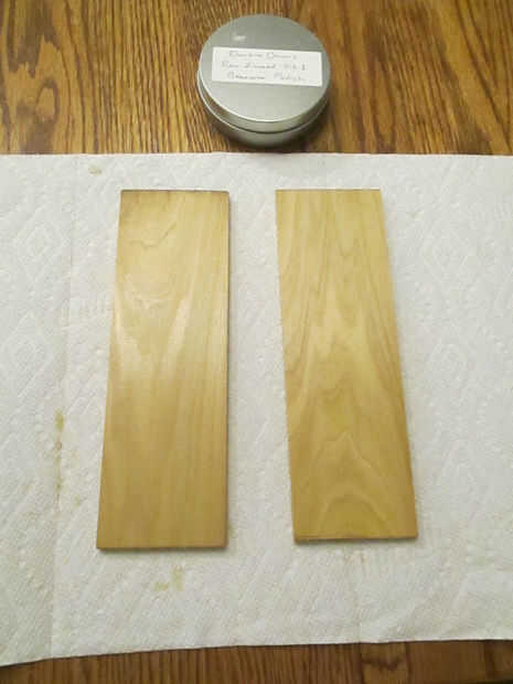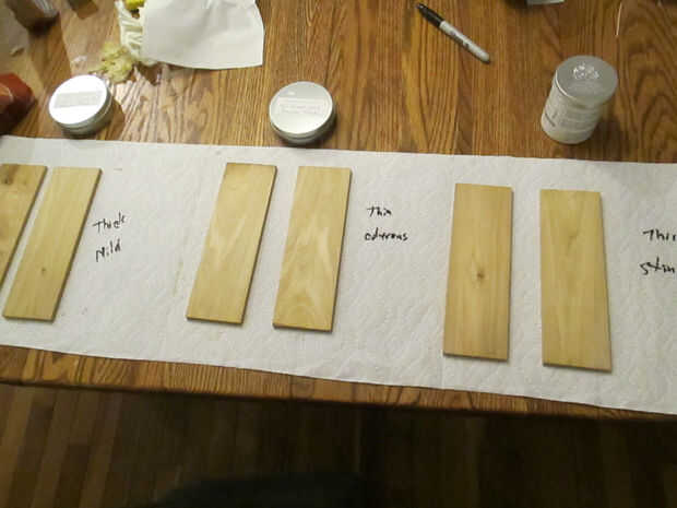 Yo corte la tira en 6 pedazos para los listones y decidí experimentar con diferentes acabados que tenía, el ganador sería determinar lo que se utilizaría para el resto del proyecto acabado. Tuve tres acabados a mi disposición: 1. aceite de Tung/cera final 2. Aceite de linaza/cera acabado 3. Renacimiento a la cera bioTec. Mis pensamientos/resultados son los siguientes: