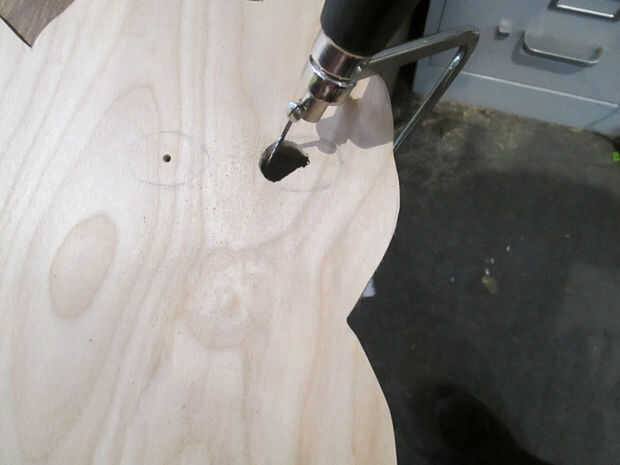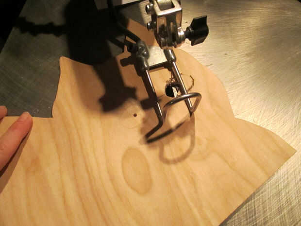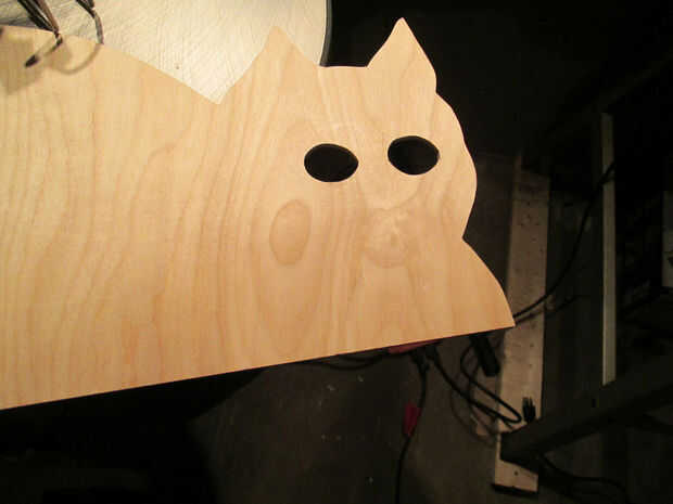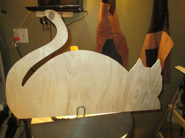 Al principio, pensé que podía usar mi lujo Sierra de marquetería de Robert Lawson para esto. Que no, o no. Estaba un poco tensionado. Terminé llevando a la Sierra de calar. Todo era bueno. Los ojos eran un poco más grandes que yo quería, pero la Kitty (el Real One), termina frente a la otra forma para una mejor visión de los seres humanos que puede caminar por que para posiblemente alimentarlo y así incluso no divertirnos mirando a través de los ojos de gato. (Las sombras que producen los ojos y la cola son divertidísimas, aunque, especialmente cuando el Kitty es allá arriba, mueve su cola y flagrantes independientemente con sus perfectos ojos color ámbar)