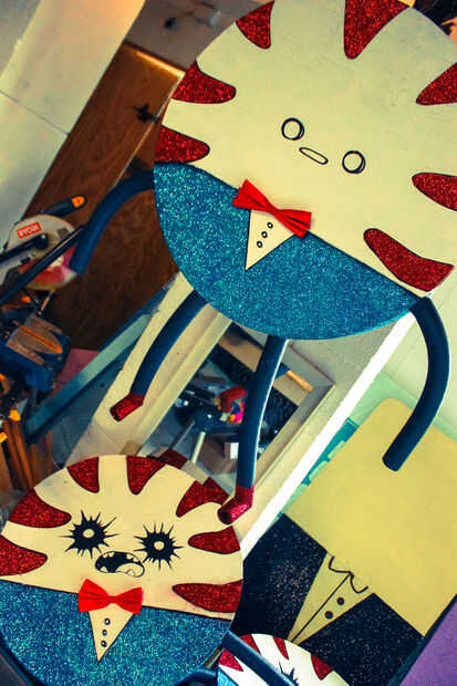 Para colgar estos personajes me perforar pequeños agujeros en la espalda con un squrt de pegamento caliente y luego insertar ganchos. Una vez seco, até tanza transparente para colgar.