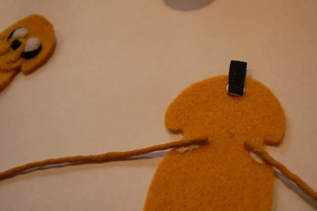 Pegar la cadena de brazos y piernas en la parte posterior del cuerpo utilizando una pequeña cantidad de pegamento. Coloque un pequeño bucle de cinta a la parte posterior de la cabeza con pegamento.